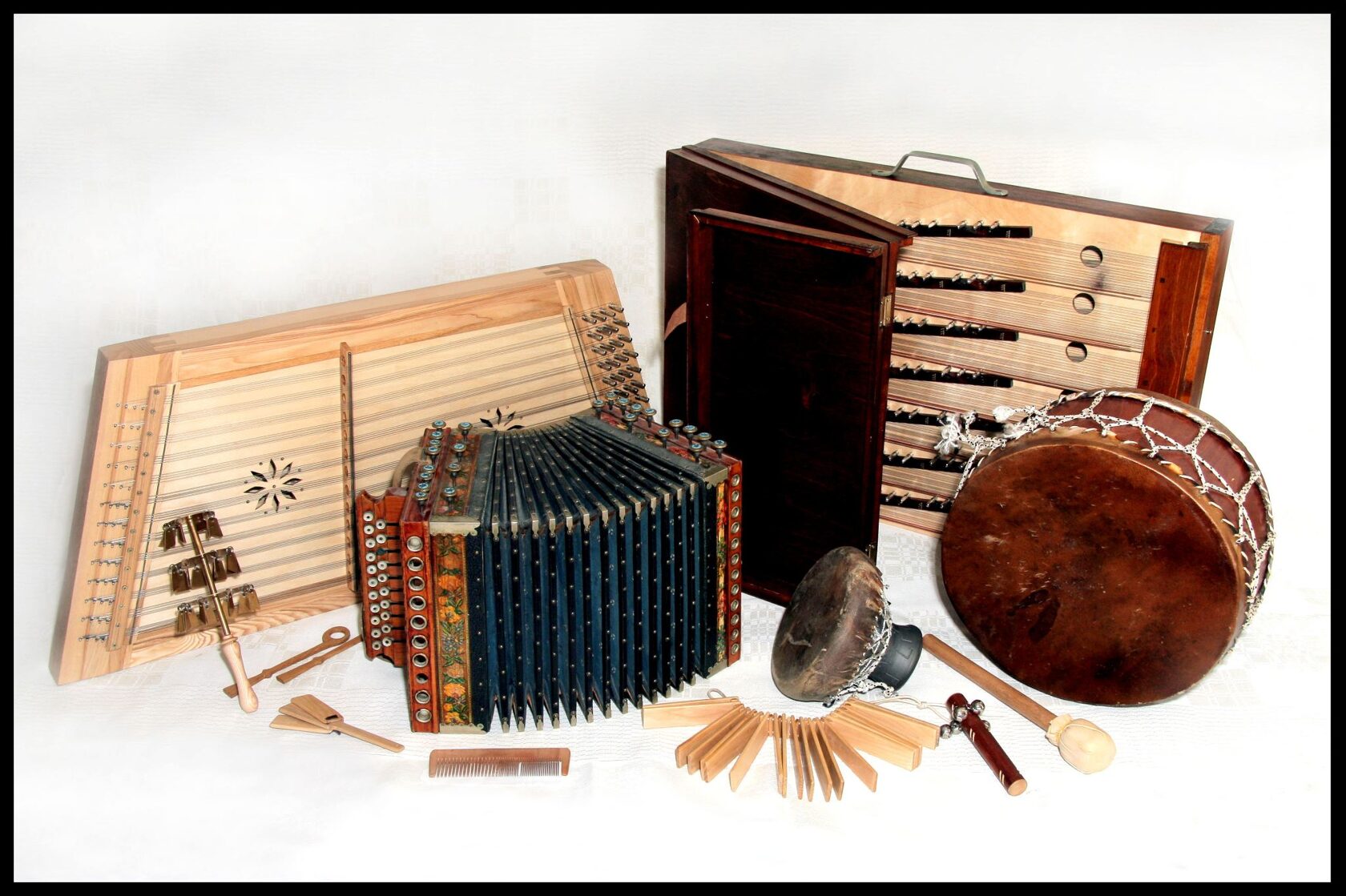 Senlaiku mūzikas instrumentu muzejā var skatīt vairākus desmitus dažādas ermoņikas un garmoškas, 12 akordeonus, vairākas mandolīnas, senu cītaru kolekciju, celma bungas, kokles, dažādus metalofonus, ksilofonus, Latvijai raksturīgas perkusijas. Stāsts par mūzikas instrumentiem, kas spēlēti pēdējos 150 gadus Latvijas teritorijā, kā arī dažādu mūzikas instrumentu vēsture - "dzīves ceļš”, līdz nonāca muzejā, muzicēšana. Tiek rādīta spēlēšanas tradīcija, pielietojums. Muzejs piedāvā iemācīties pašam spēlēt cītaru, kokli, cimbalu.